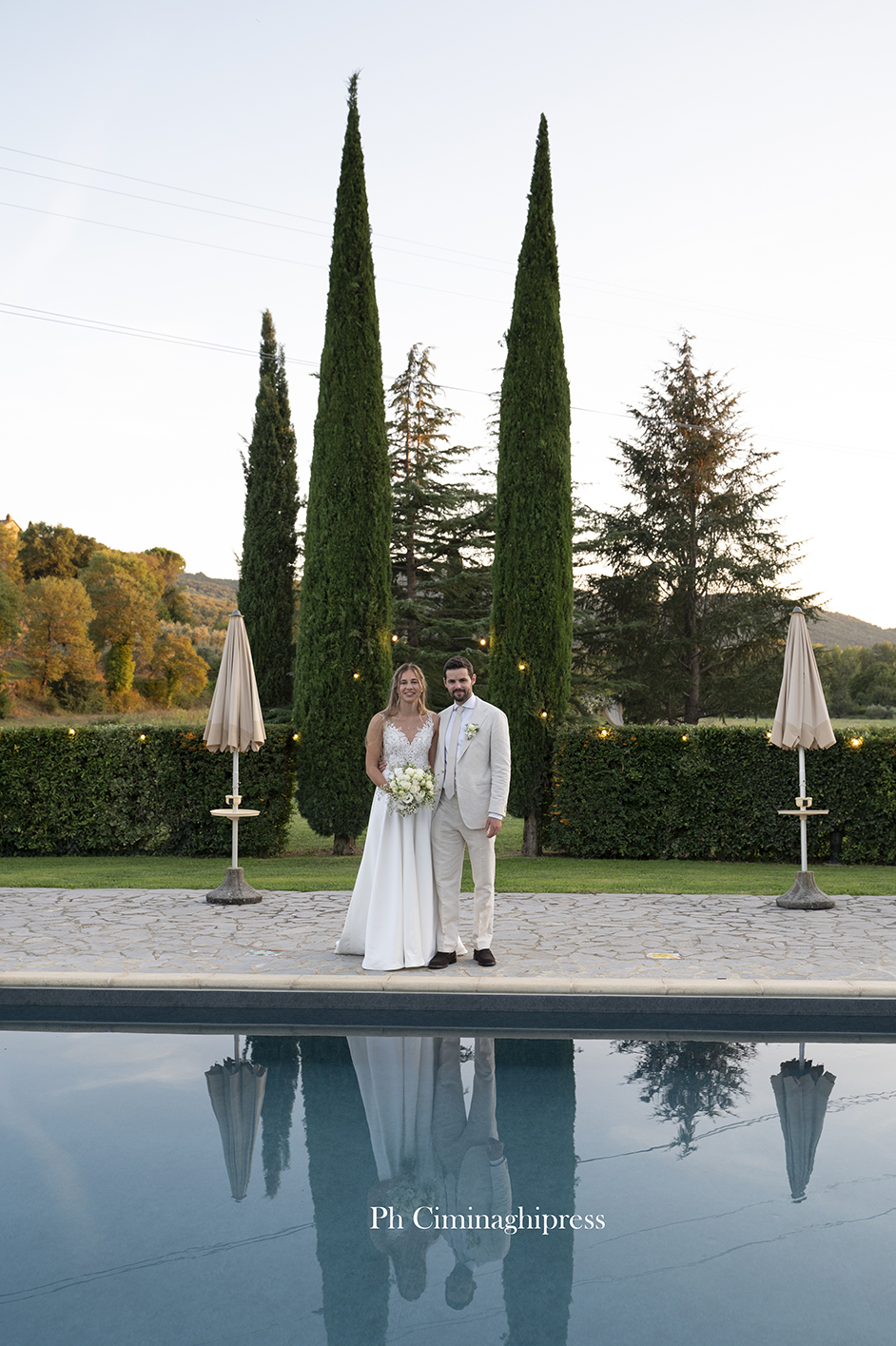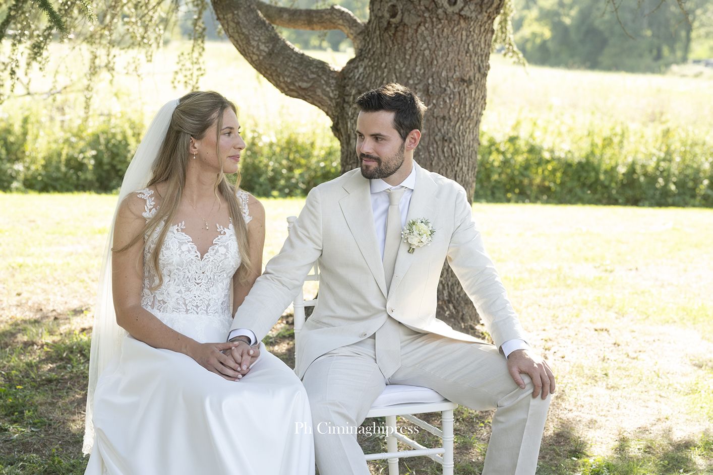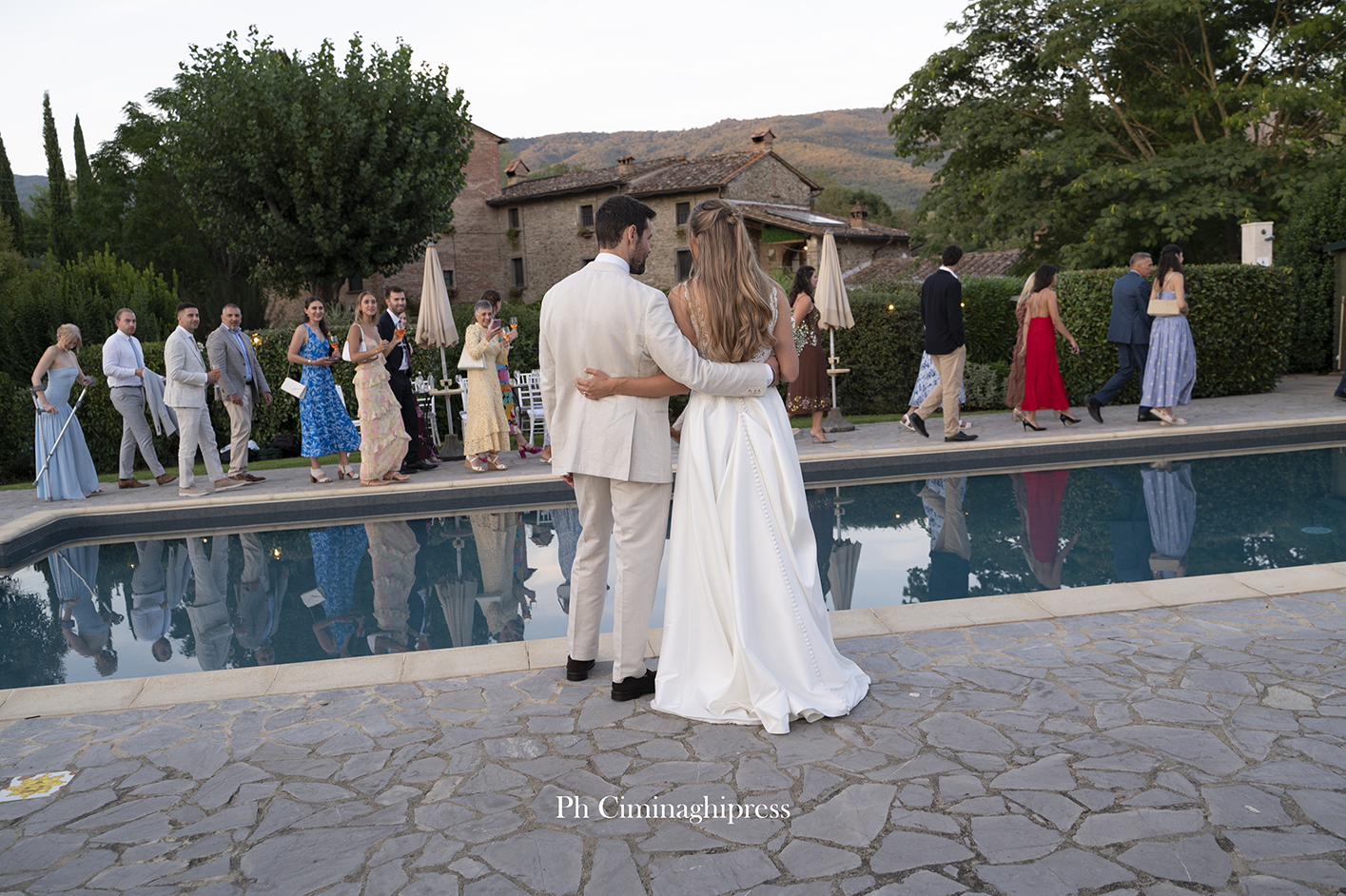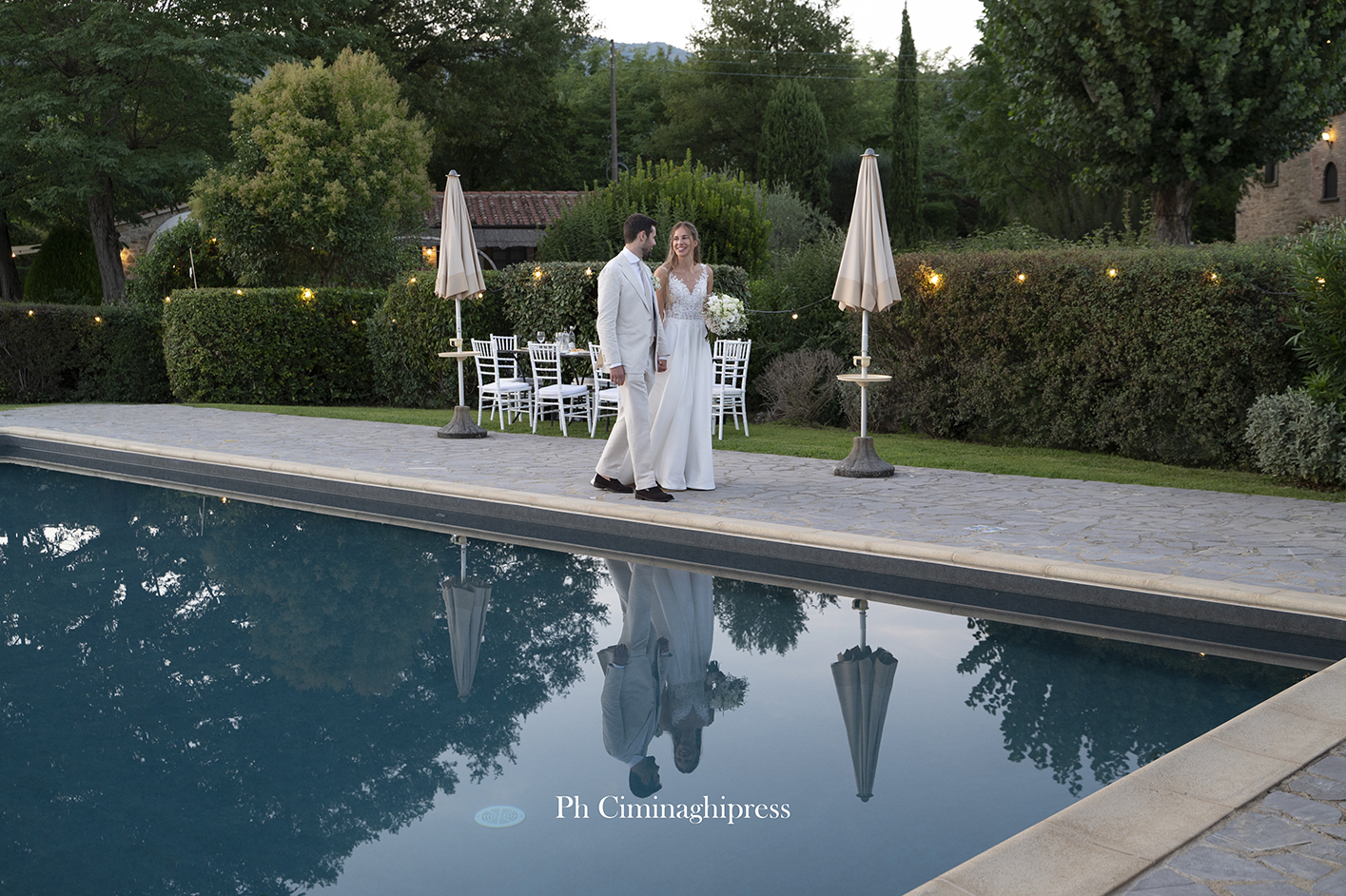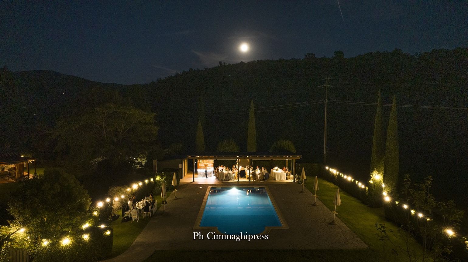 Wedding where the ceremony was held in the enchanting location Molino di Bordone, the service to the bride and groom with the sunset was very suggestive and the dinner by the pool created a splendid atmosphere.